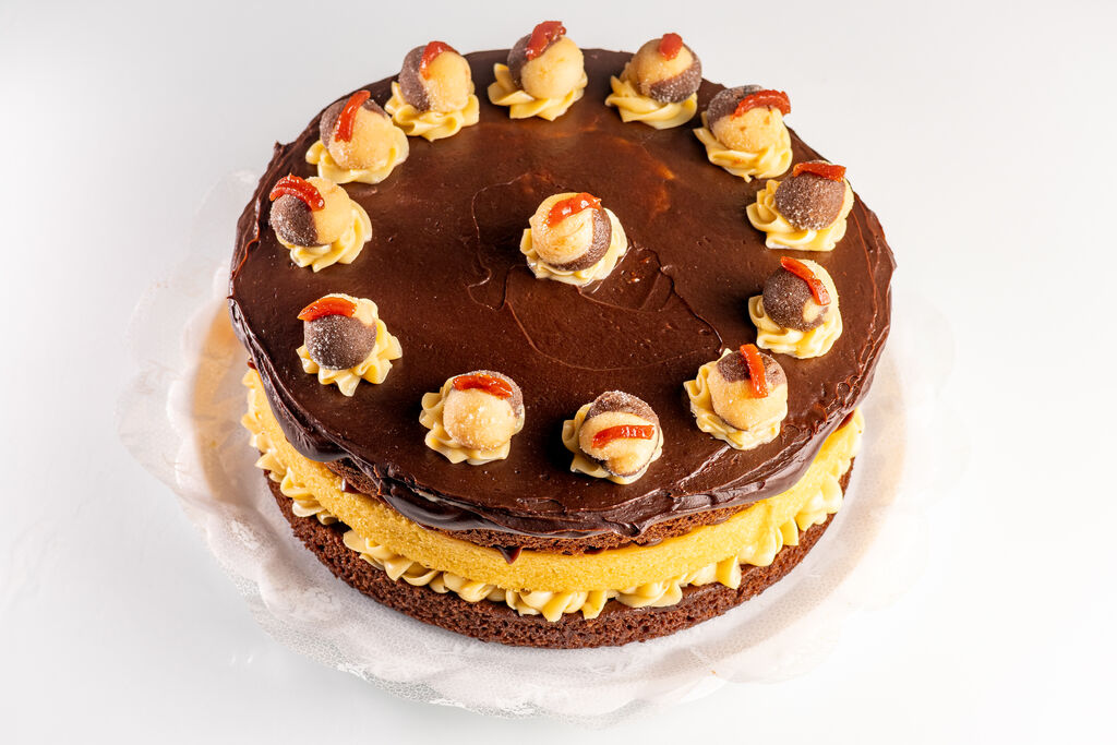Bolo de chocolate,bolo branco, recheio de brigadeiro branco e brigadeiro de chocolate com creme de goiabada. *pedido mínimo de 1 unidade(s) Selecione uma opção de Tamanho Torta Grande Média Pequena Adicionar ao Carrinho Quantidade: Descrição